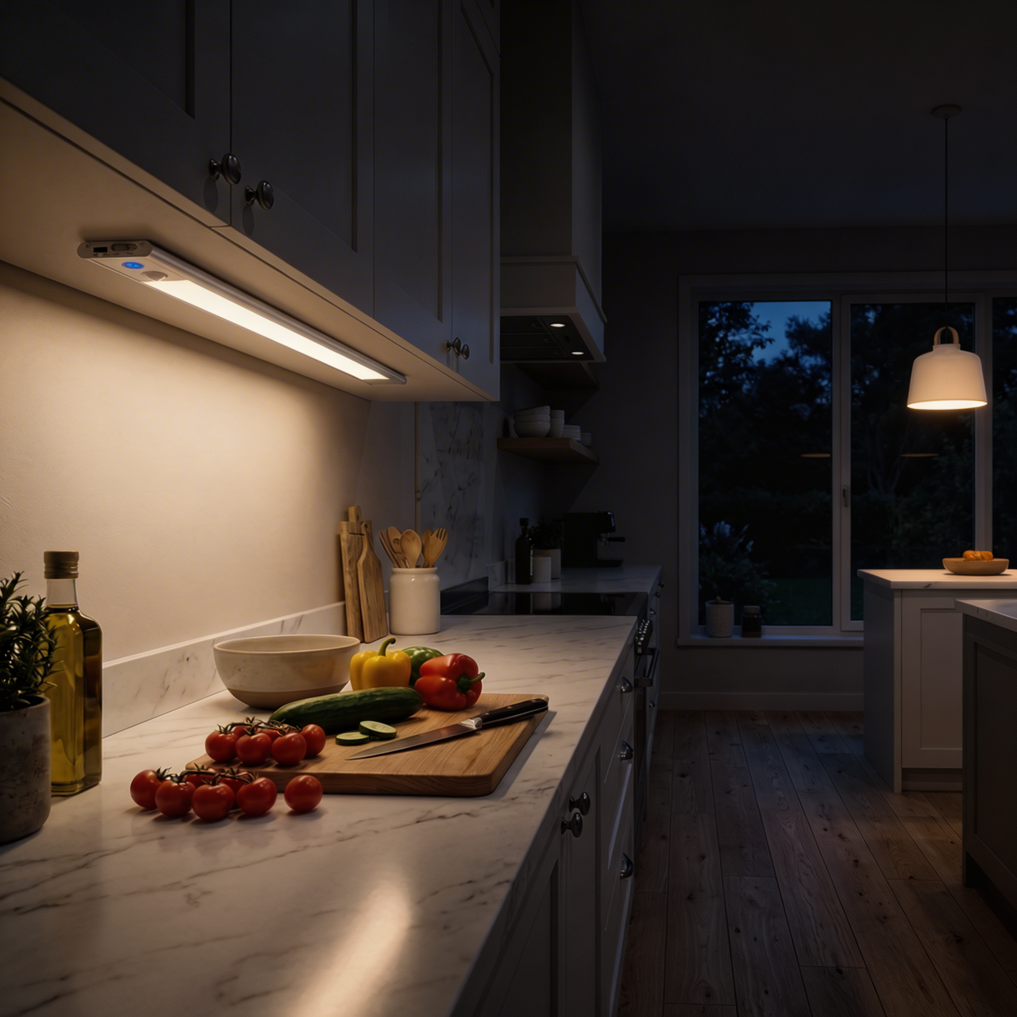 Lumină caldă exact unde tai, amesteci sau servești. Se lipește magnetic sub dulapul suspendat și iluminează tot blatul uniform. Te trezești la 6 dimineața? Ai lumină fără să deranjezi pe nimeni — senzorul o aprinde doar când ești acolo.
