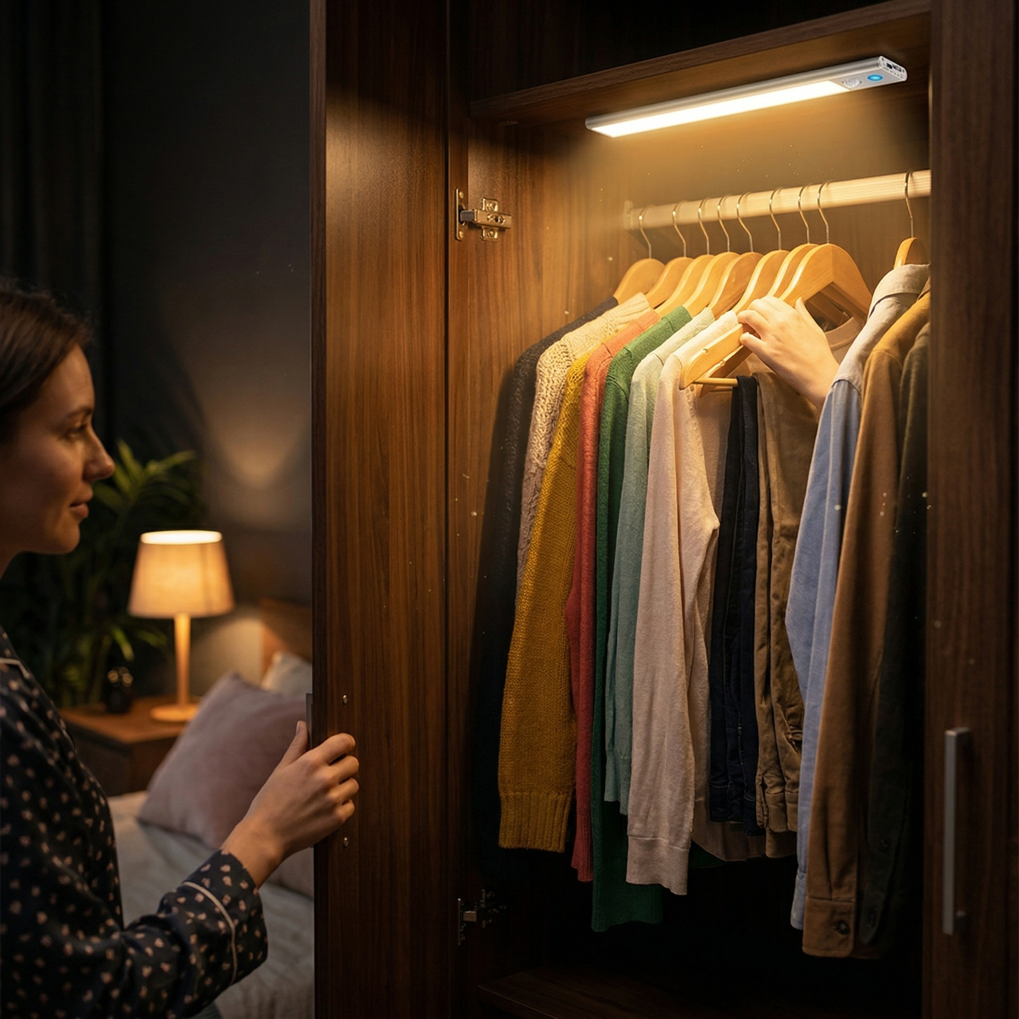 Nu mai căuta pe întuneric prin haine. Lampa se aprinde singură când deschizi ușa și se stinge după 15 secunde. Montaj magnetic pe raft sau bară — fără găuri, fără cabluri. Dimineața te îmbraci fără să aprinzi lumina în cameră.