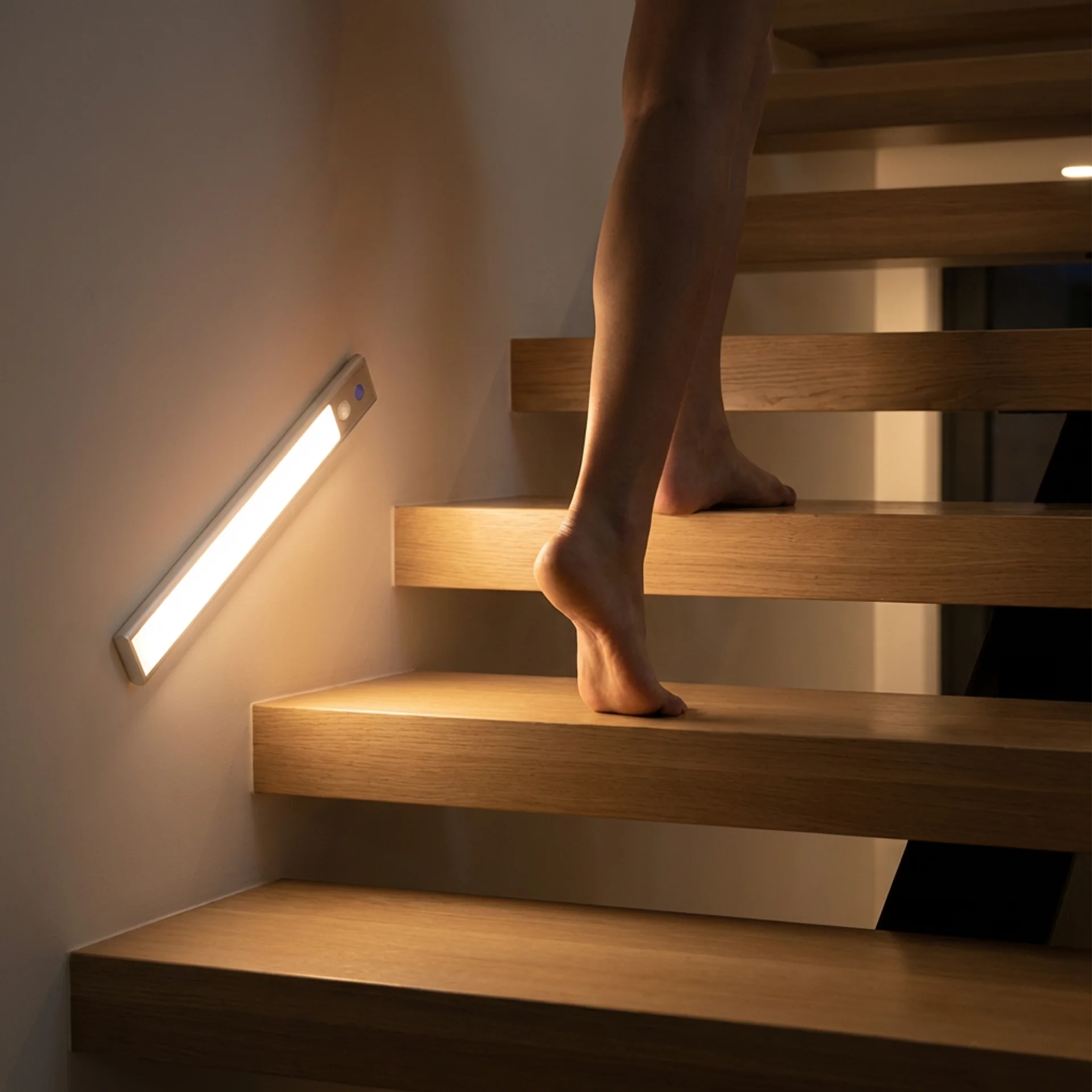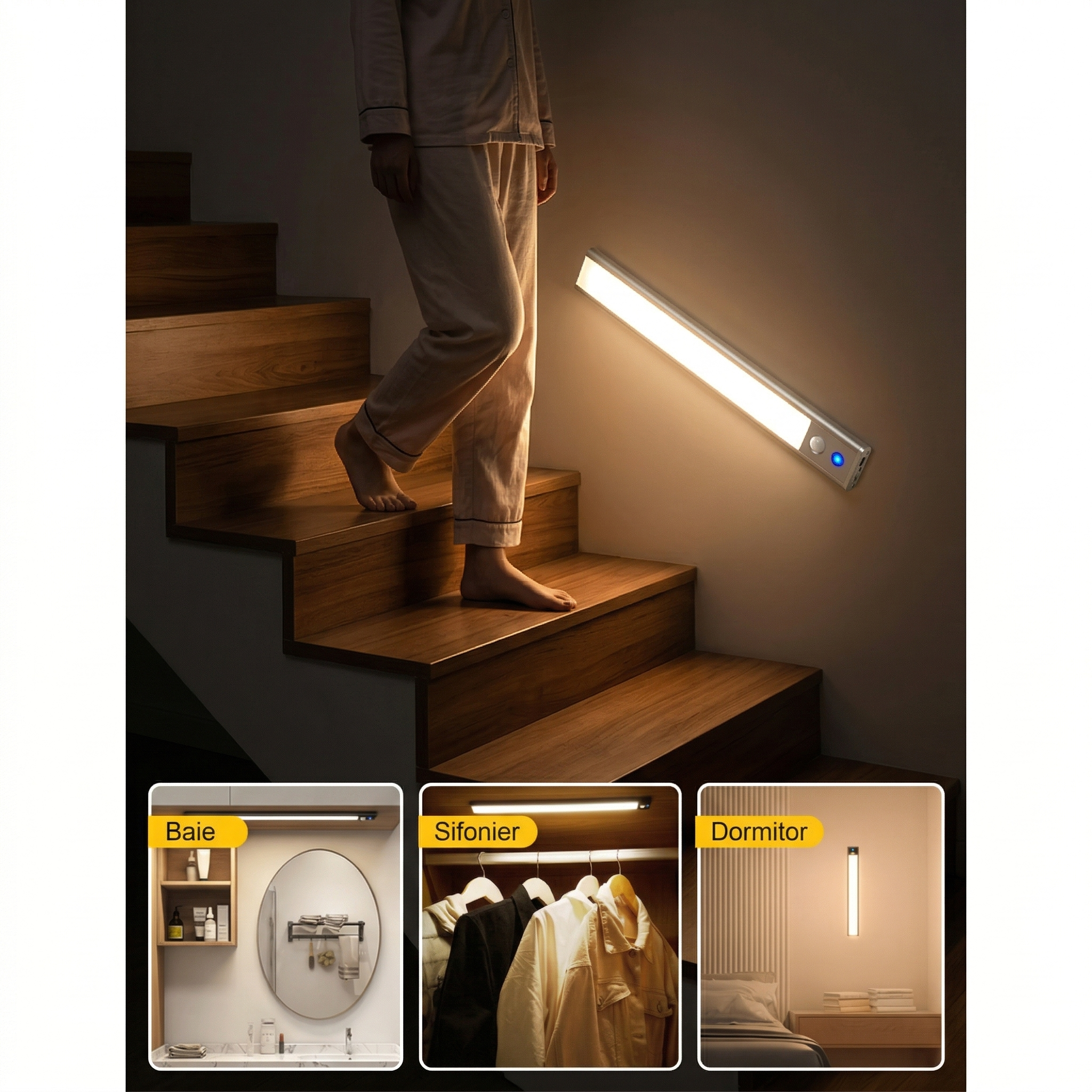 Fiecare treaptă devine vizibilă noaptea, automat. Senzorul detectează mișcarea de la 3 metri și iluminează calea în fața ta. Fără să cauți întrerupătorul pe perete, fără să te împiedici. Sigur pentru copii și vârstnici.